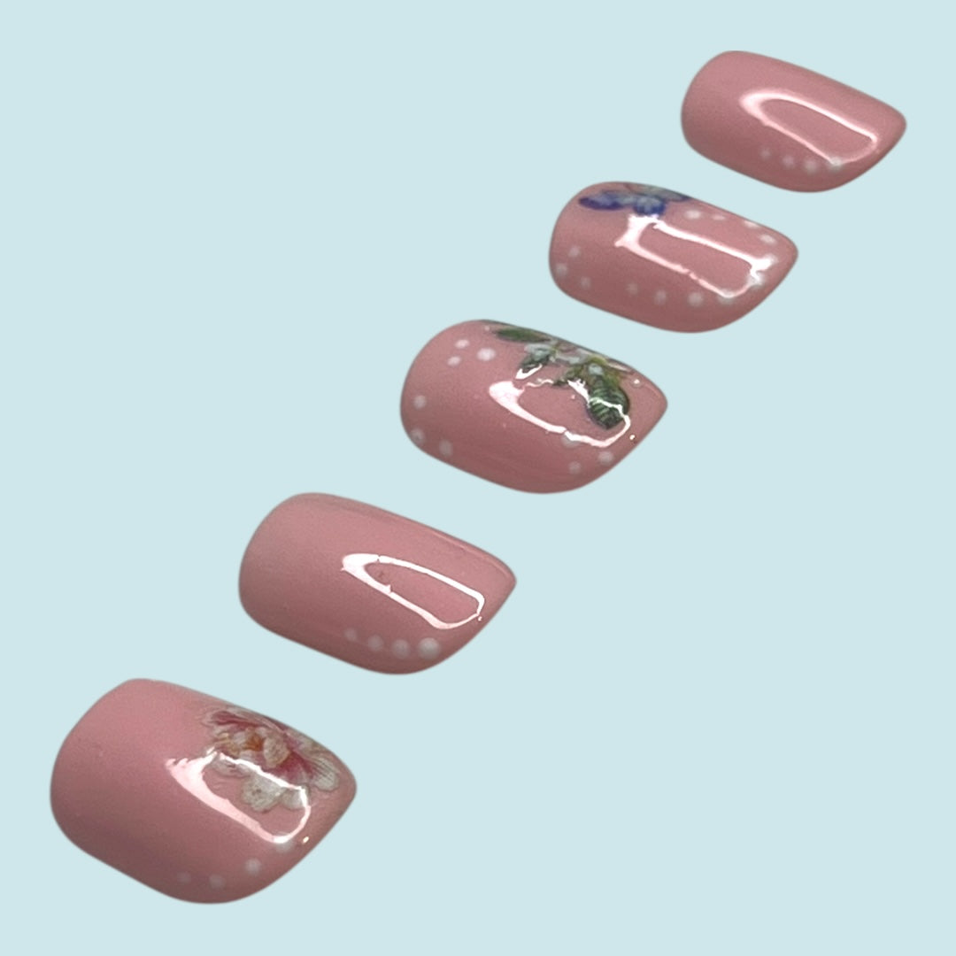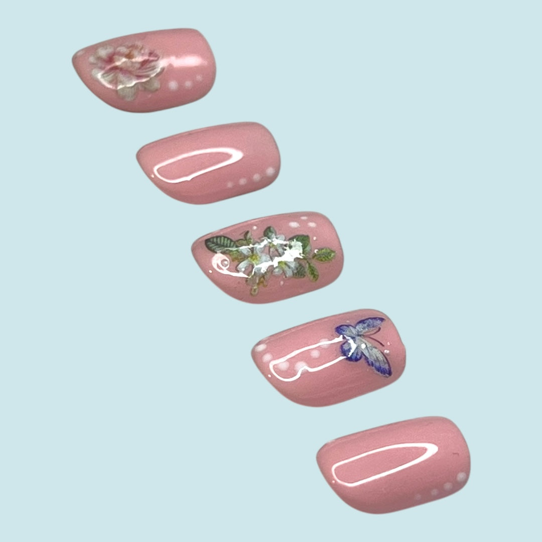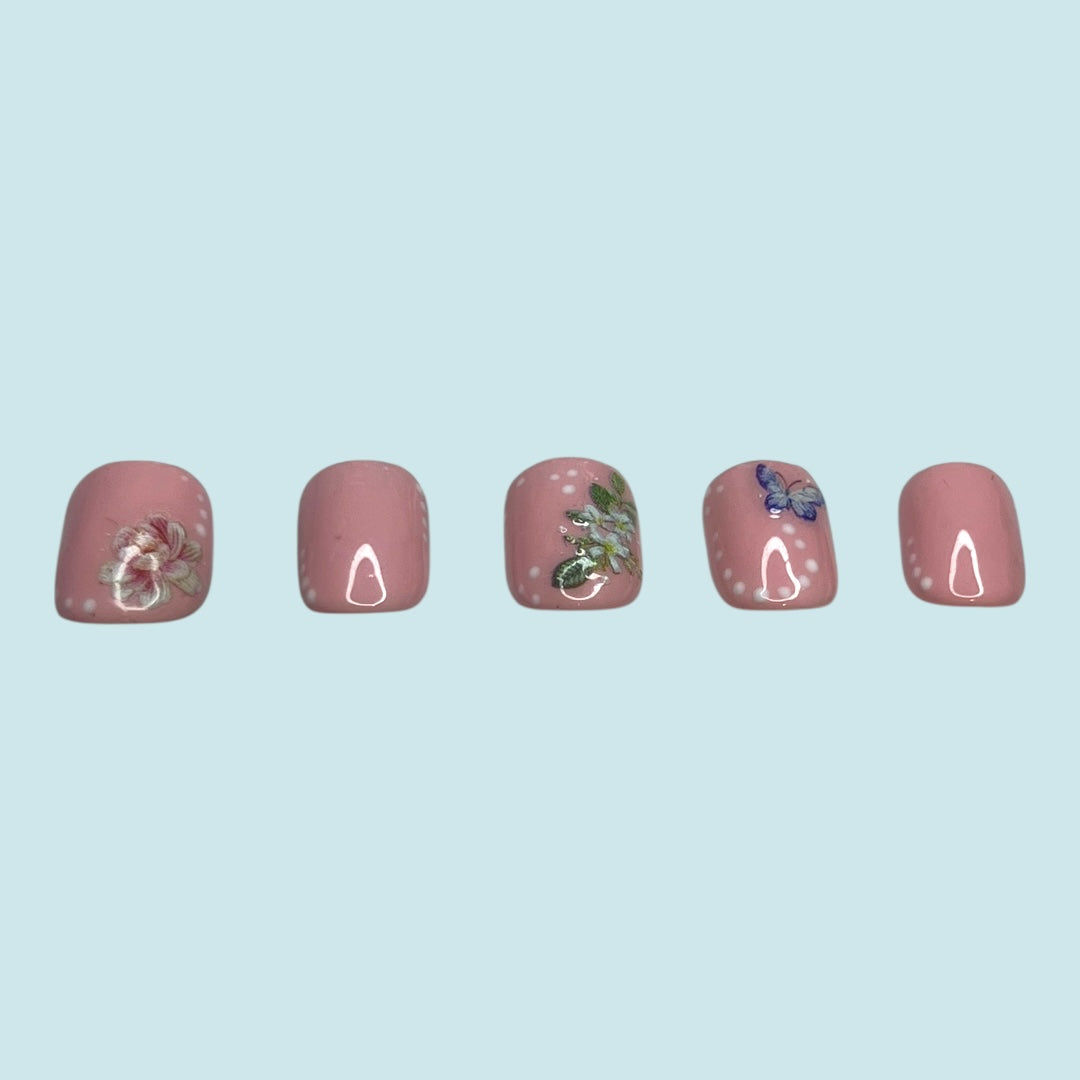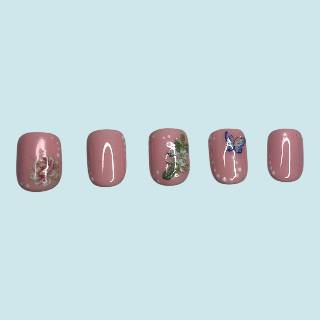 What better way to enjoy spring other than having this floral press on nail set adorned with a beautiful butterfly looking for their next flower to rest upon?