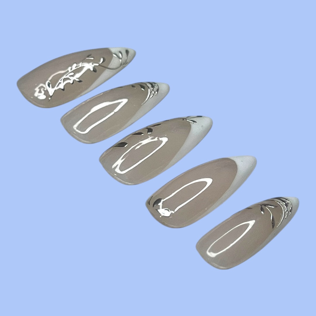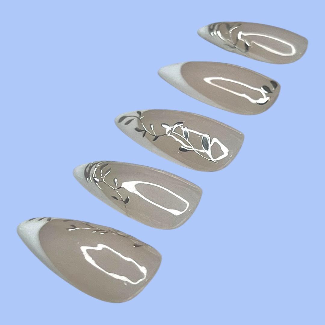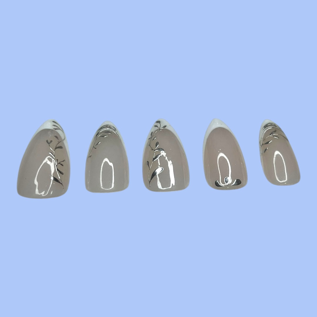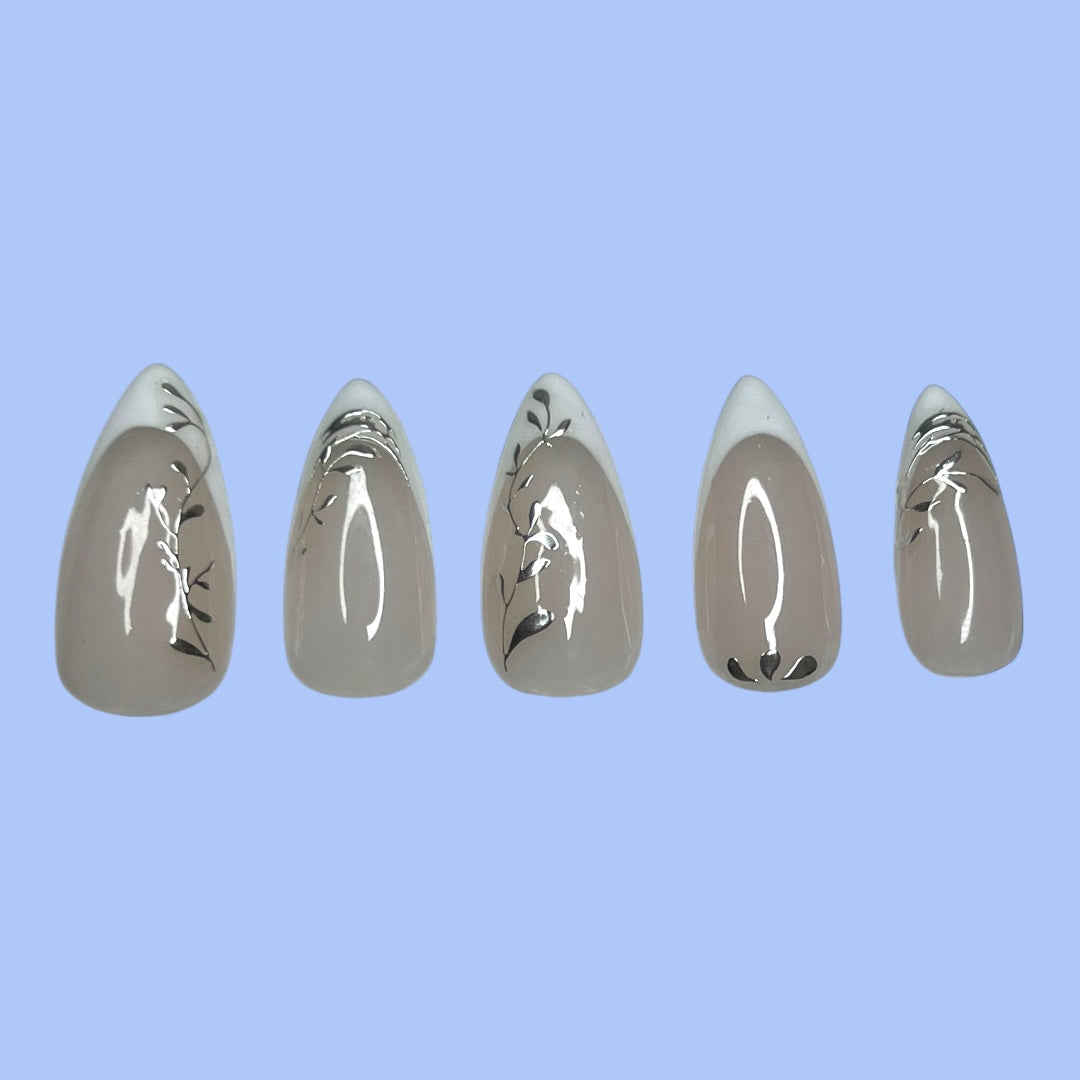 Taking a fancy twist on floral and foliage, these silver adornments add that extra dazzle to the classic French nail style.