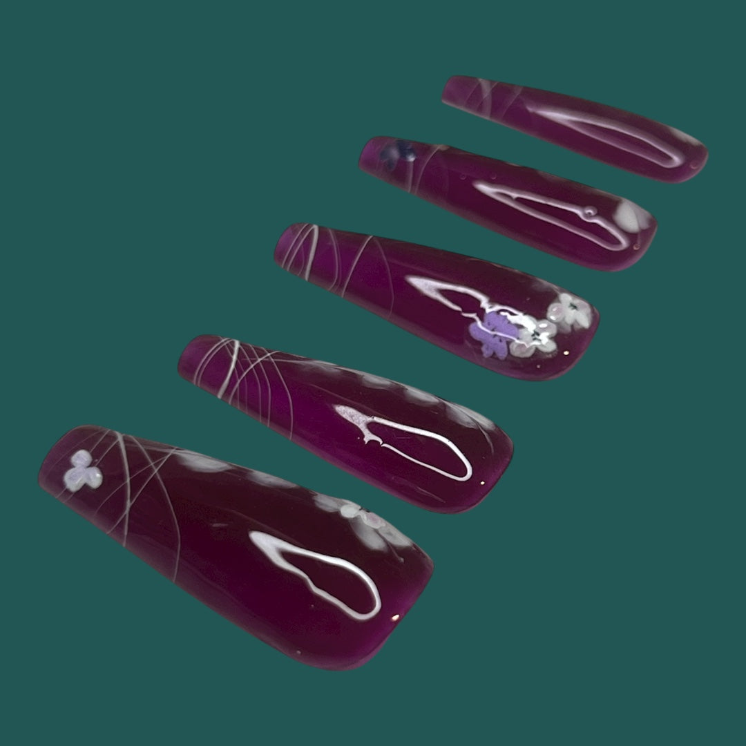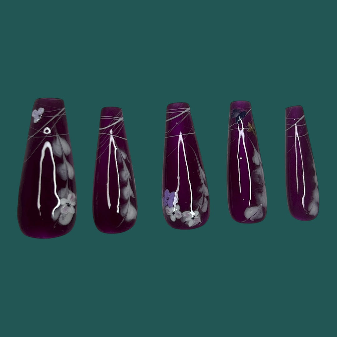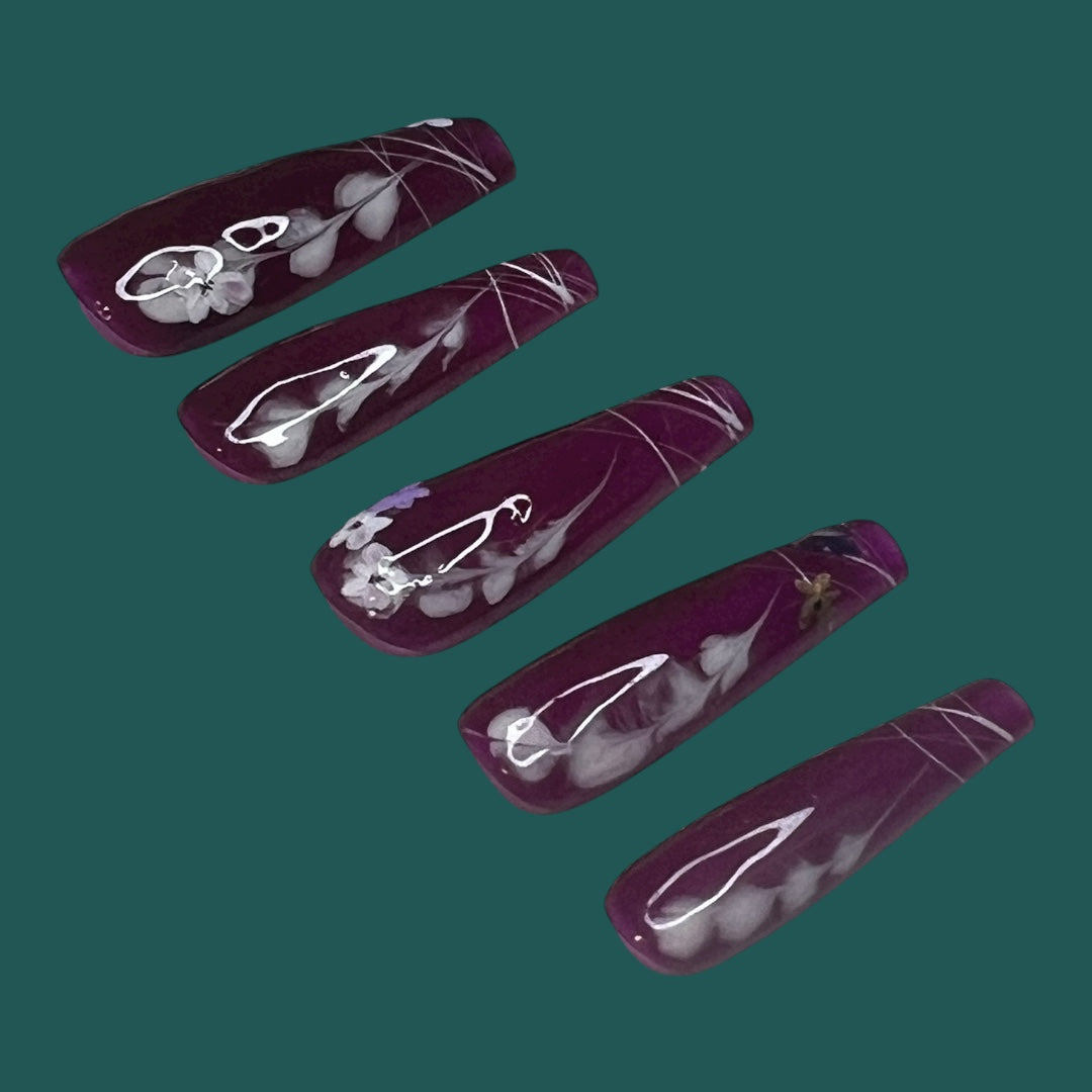 Medium length coffin press on nail set perfect for the classy individuals with a love for wine and Flora. Available from sizes extra small to extra large.